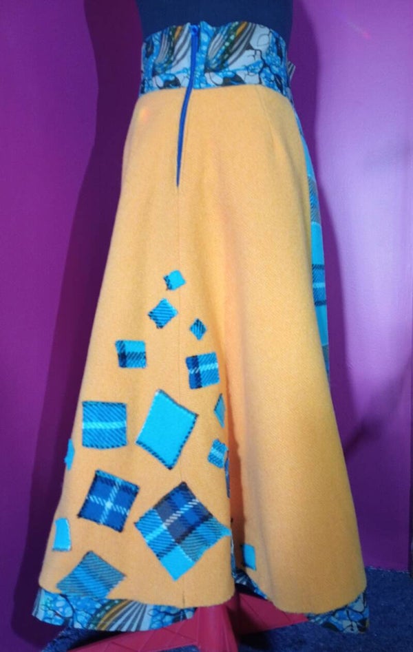 Features a side zip, one pocket, a lovely african-print cotton batik waist and 'falling blocks' motif to one side.